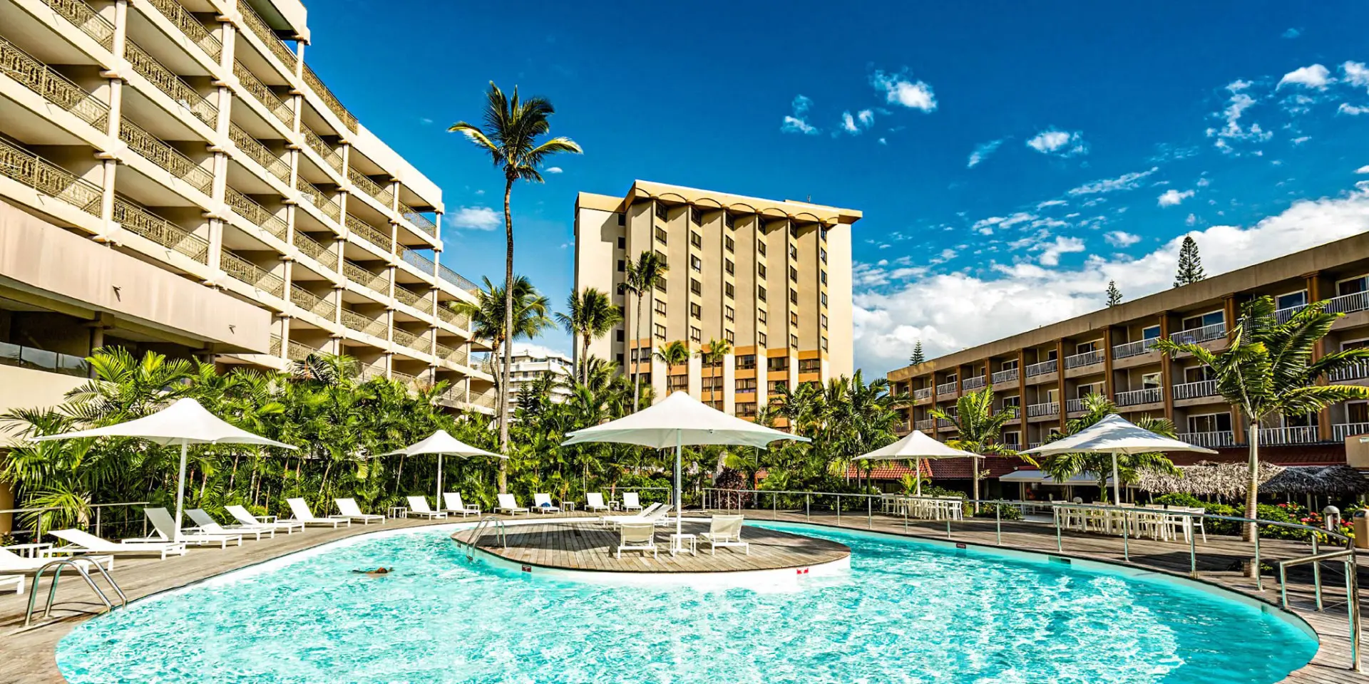 In Nouméa, a large pool to enjoy the sun—between palm trees and relaxation.